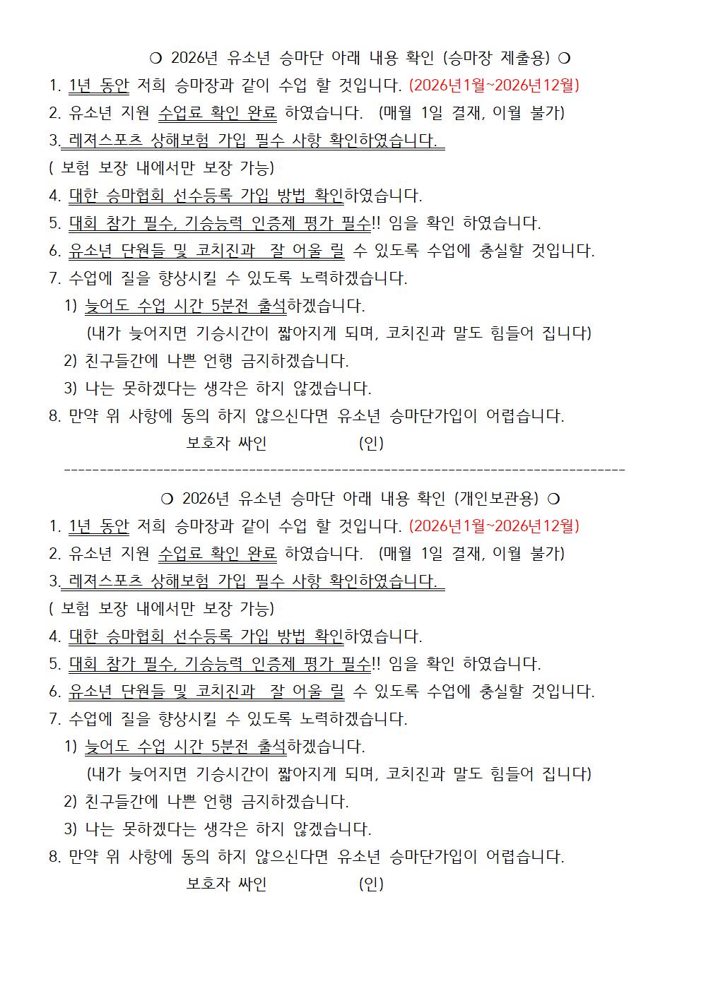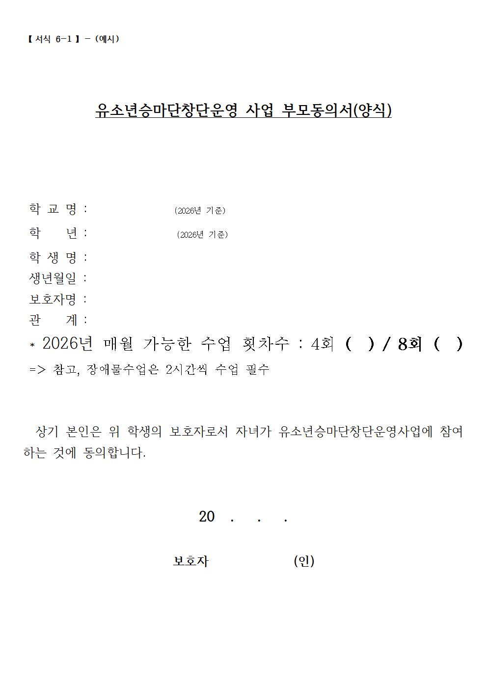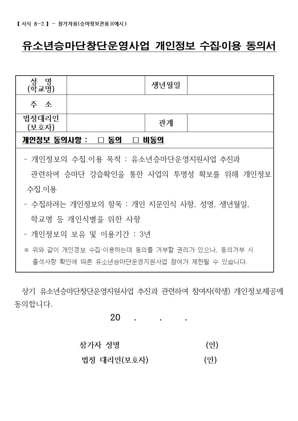 [산들래승마클럽 유소년단 가입신청서 양식]